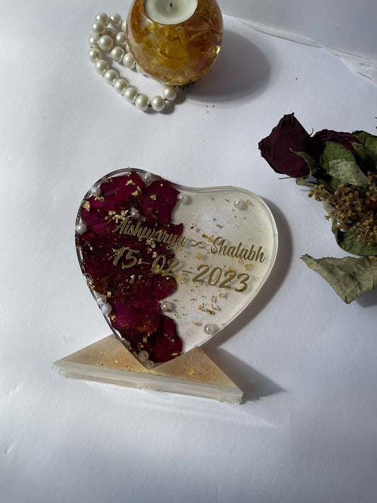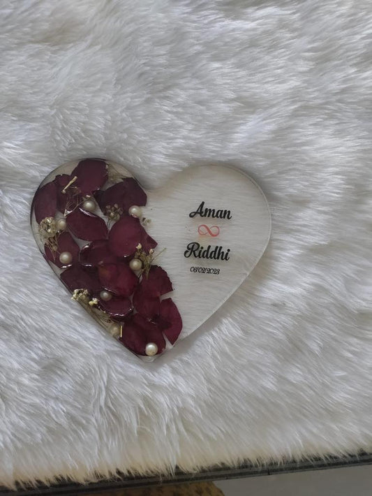 Floral Romance Heart shaped Coaster with Couples Name and Preserved Rose Petals