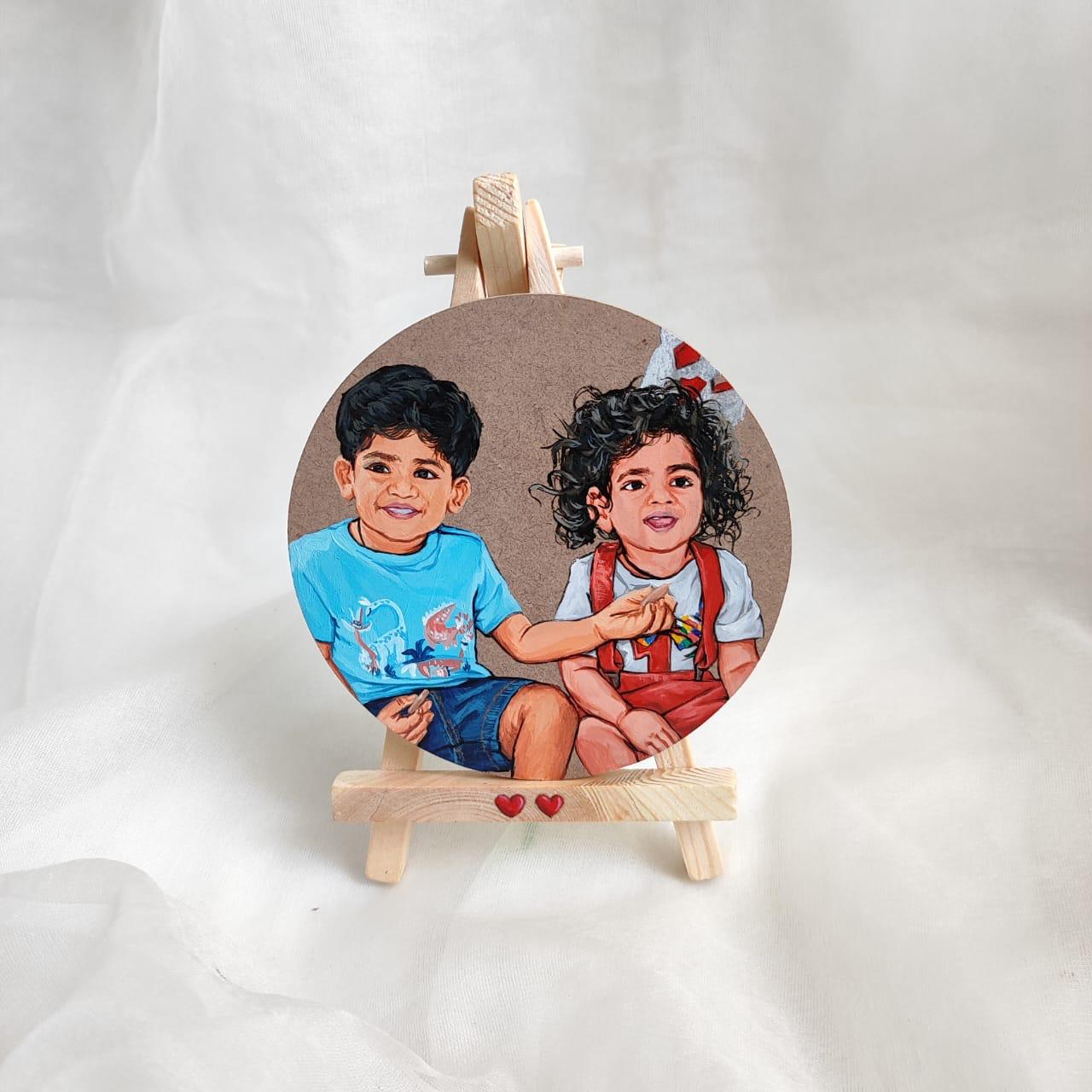 A hand-painted portrait on MDF celebrating the unique bond between siblings, portraying their shared memories and unbreakable connection with every stroke of the brush. "In the canvas of life, siblings paint the most colorful memories. 'Bonded Brushstrokes' immortalizes their journey together