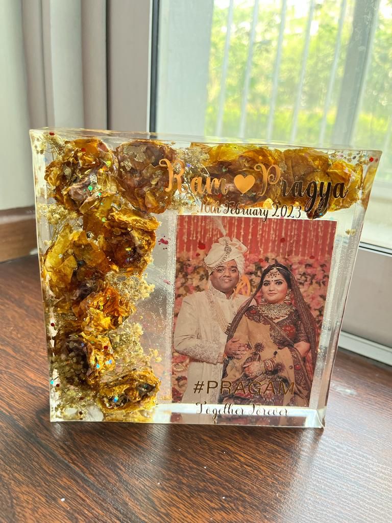 Dive into the electrifying world of Electric Love, where tradition meets innovation in this captivating resin couple square varmala preservation. This unique piece showcases the couple's varmala, carefully encased in resin, preserving the beauty and significance of their wedding ritual. The square shape adds a contemporary twist, symbolizing the couple's modern love story.