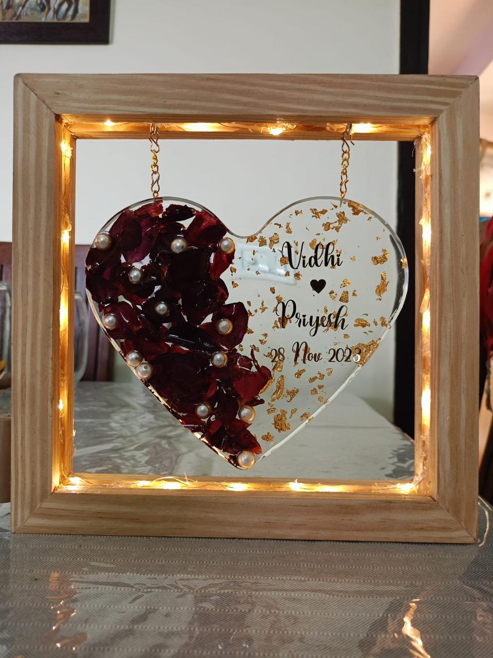 Crafted with precision, the heart-shaped resin encases your personalized elements - perhaps delicate flowers, cherished mementos, or captivating designs - suspended in a translucent, glossy finish. The wooden frame provides a natural and elegant border, enhancing the enchanting glow emitted by the embedded LED lights.