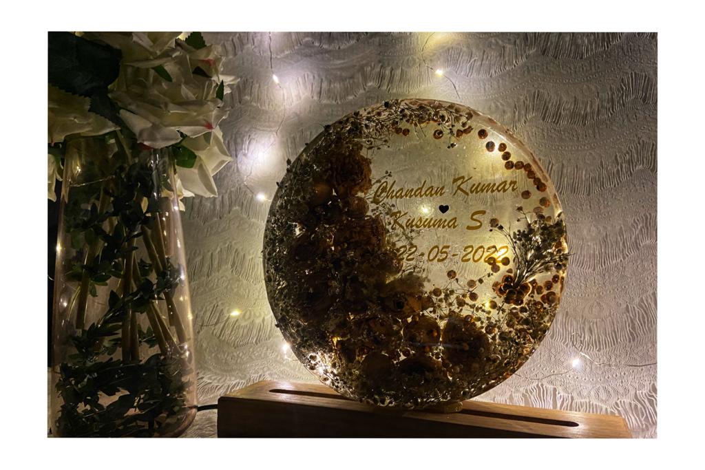 The result is a beautiful, one-of-a-kind artwork that encapsulates the essence of the wedding day, preserving the symbolism and emotions of the varmala exchange. This custom-made resin art becomes a timeless piece of decor, perfect for display in your home or as a heartfelt gift for anniversaries or special occasions, serving as a constant reminder of the cherished moments from your wedding day.