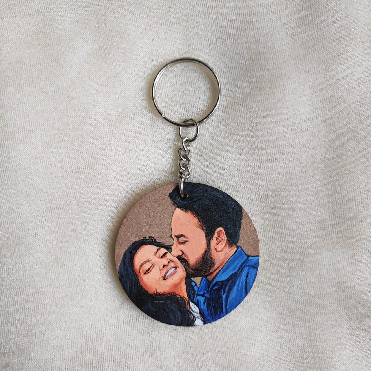 A hand-painted keyring crafted on a sturdy MDF base, showcasing intricate details and vibrant colors in a portable keepsake. "Carry a piece of art wherever you go. 'Miniature Masterpiece' adds flair and personality to your everyday essentials.