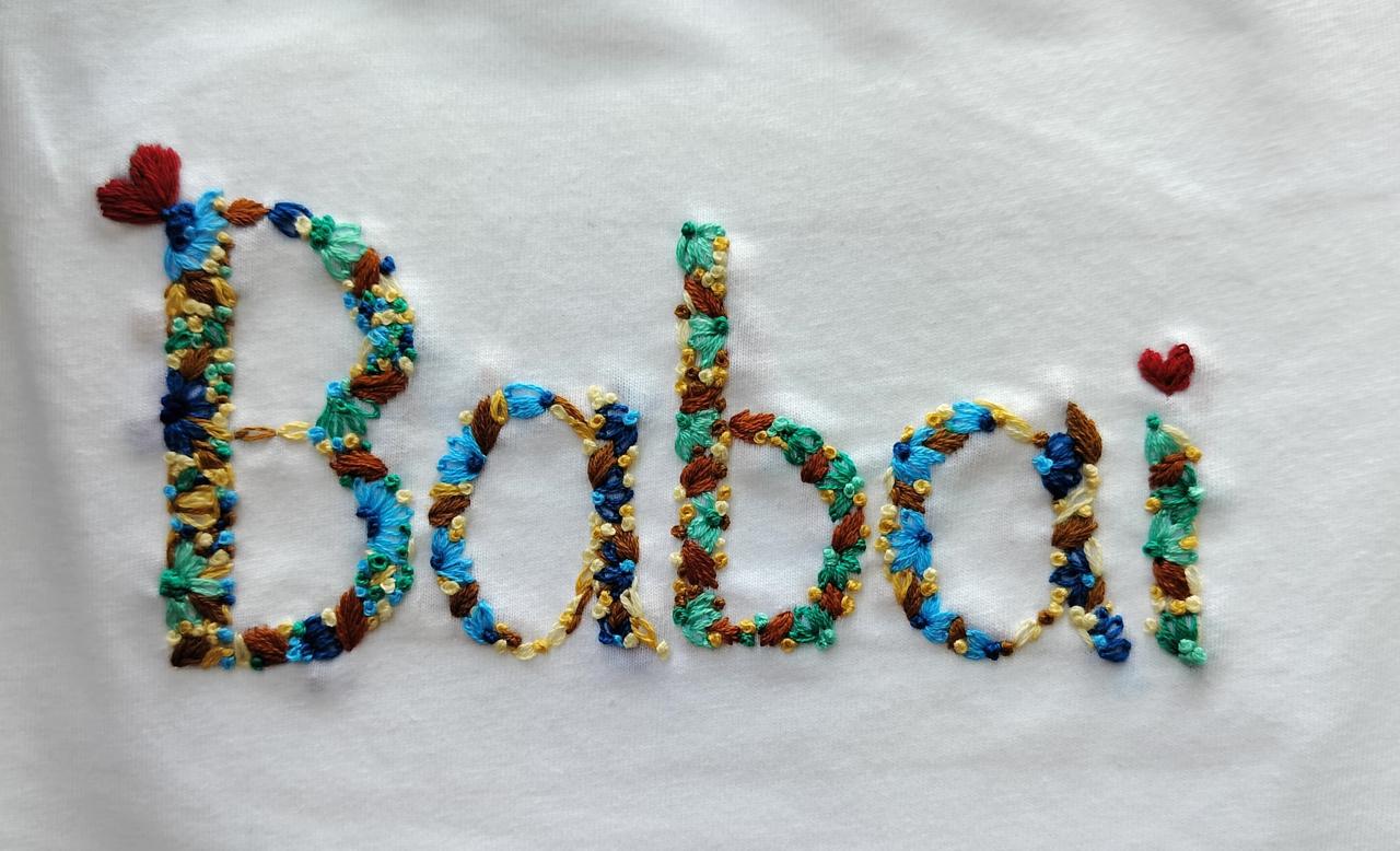 Featuring beautifully embroidered names, this handmade t-shirt combines artistic flair with personalized style, perfect for any occasion