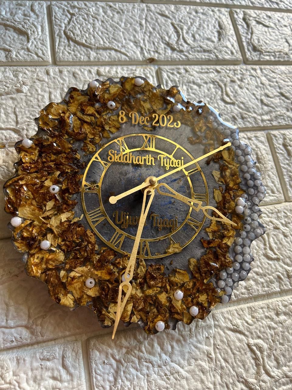 A stunning and unique personalized resin clock, handcrafted with shimmering gold flakes and decorative elements. This clock is more than just a timepiece; it's a piece of art that adds a touch of luxury and personal style to any space.