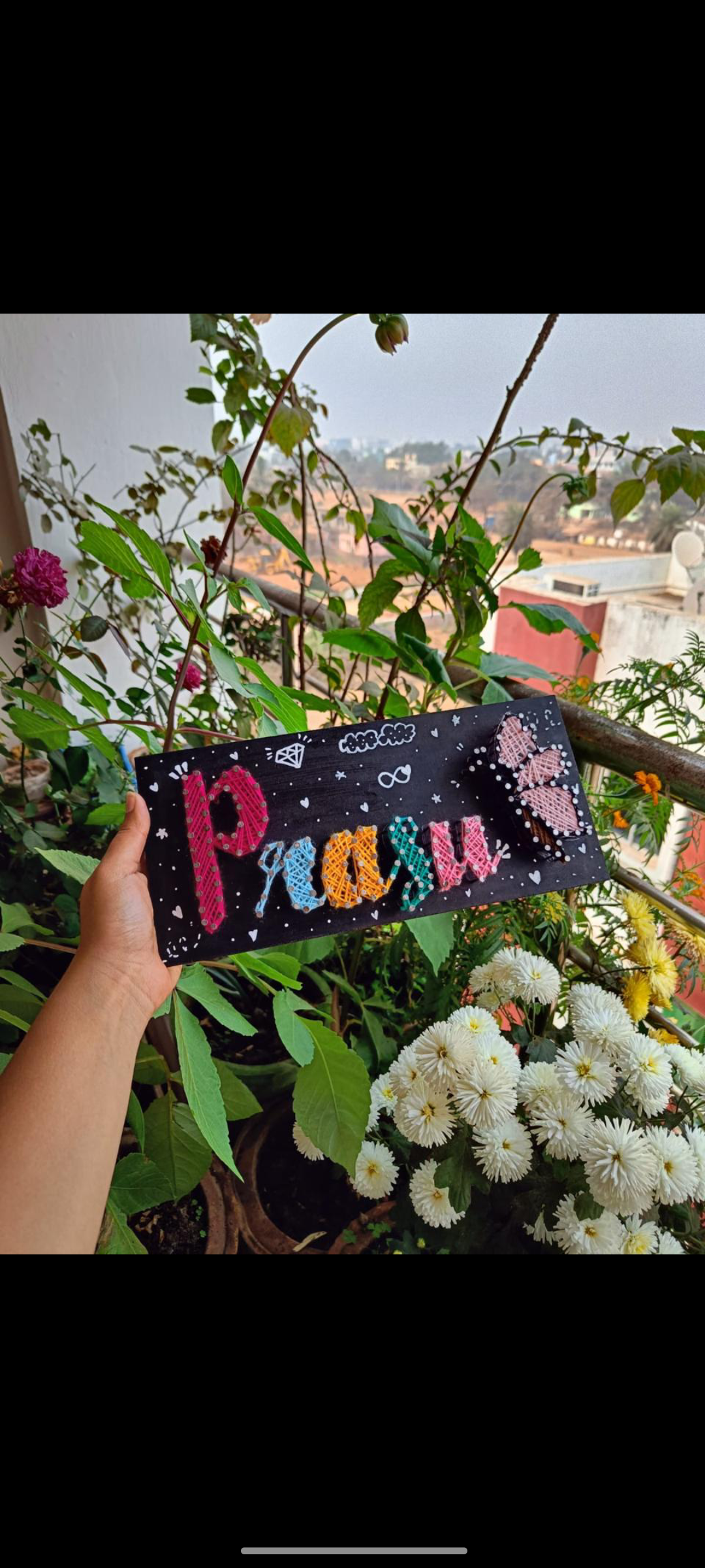 A handcrafted string art name plate featuring the name "Prasu," created with colorful threads on a dark background. This personalized piece is a unique and decorative addition to a home or workspace.
