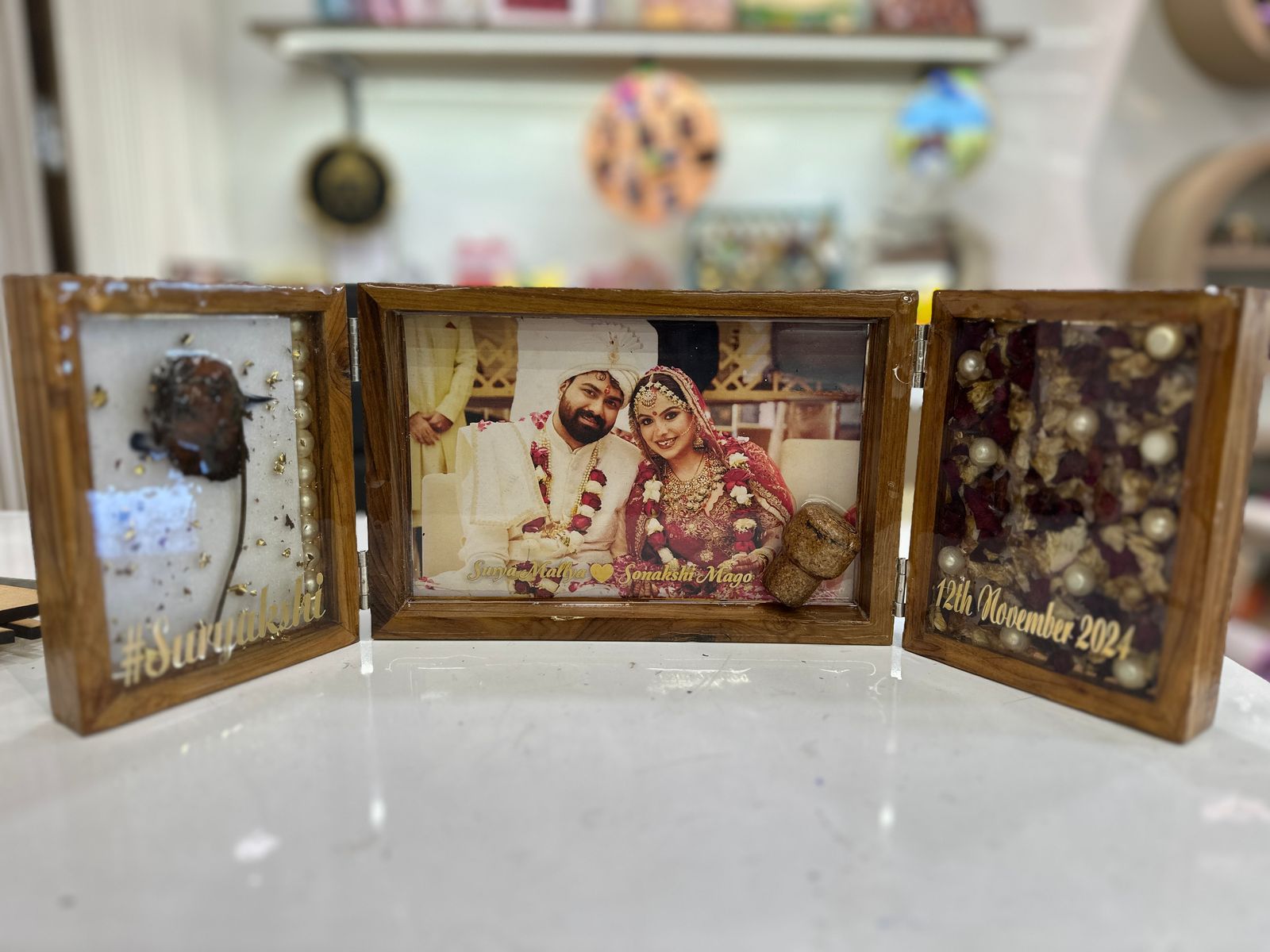 "A beautiful and unique personalized tri-fold resin photo frame, perfect for displaying cherished memories in a multi-dimensional way. This handcrafted frame features photos, preserved flowers, and decorative elements, all encased in clear resin to create a lasting keepsake.