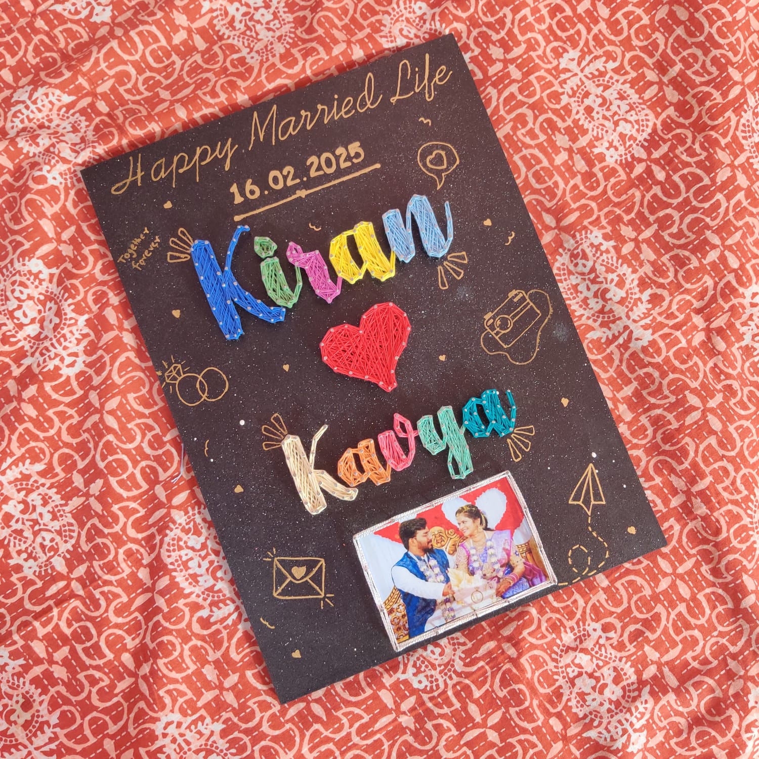 A unique and personalized string art commemorative plaque, perfect for celebrating special occasions! This handcrafted piece features names, a date, a message, and a photo, all creatively formed with colorful string on a painted background, creating a stunning and memorable keepsake.