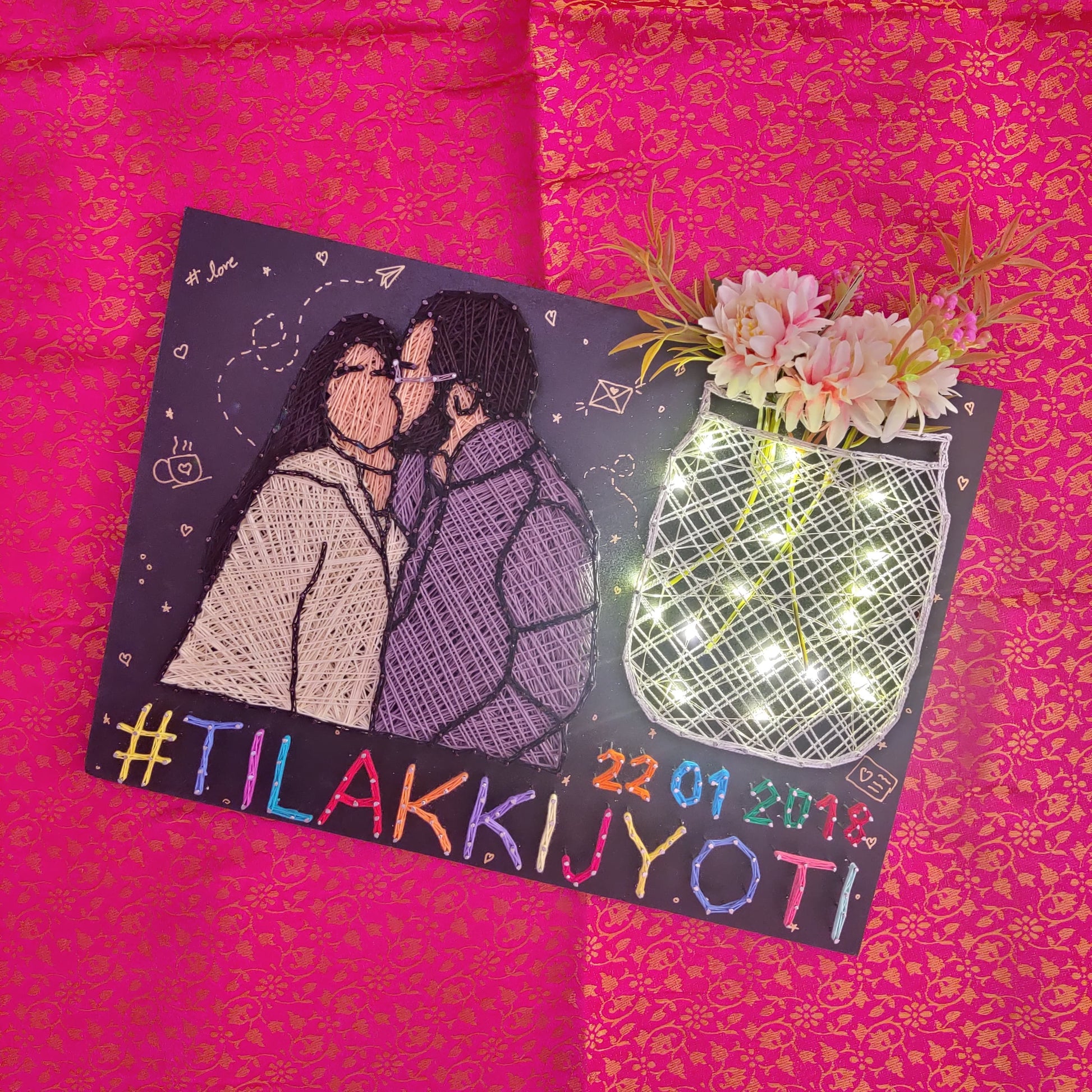 A unique and personalized string art portrait, perfect for celebrating a special couple! This handcrafted piece beautifully recreates a photo of your choice using colorful string on a painted background, and includes personalized details like names, a date, hashtags, hand-drawn designs, and a light-up jar with flowers for an extra touch of charm.