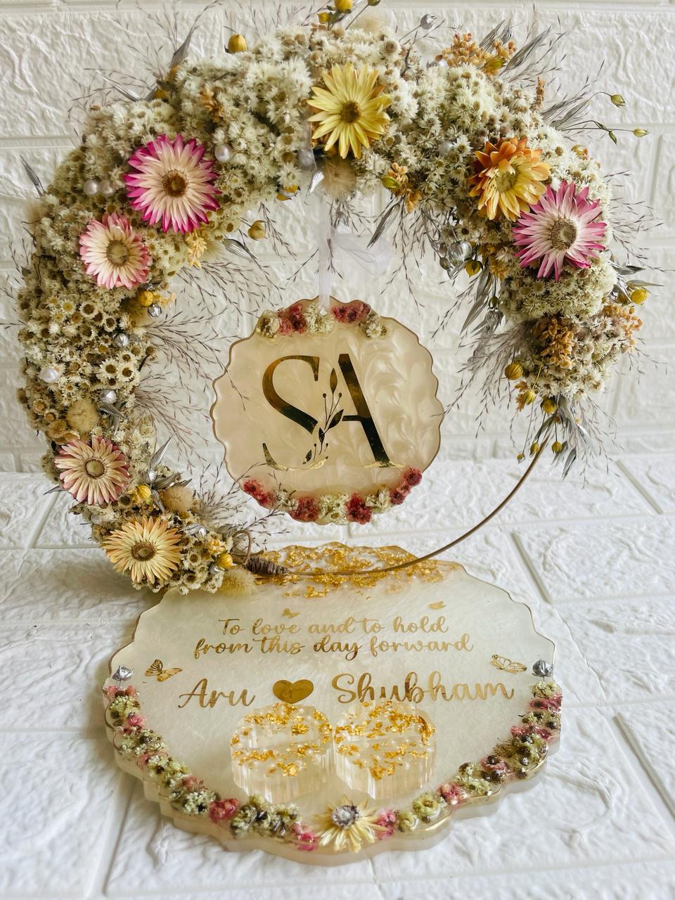 Celebrate the beginning of forever with our handmade ring platter, designed to hold your wedding rings in the most beautiful way. Crafted with love using resin, clay, florals, wood, or fabric, each platter adds a personal, artistic touch to your big moment.