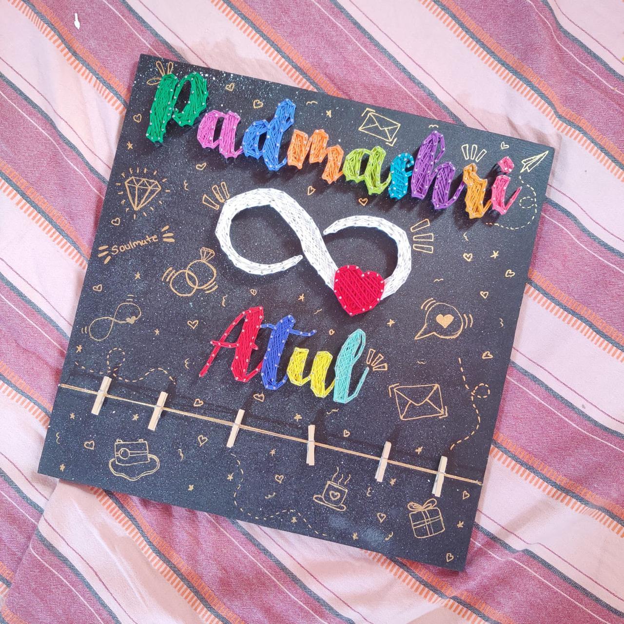 Turn names, quotes, and designs into striking wall décor with our handcrafted string art. Each piece is created by wrapping colorful thread around precisely placed nails on a wooden base — making every artwork a beautiful blend of creativity and craftsmanship.