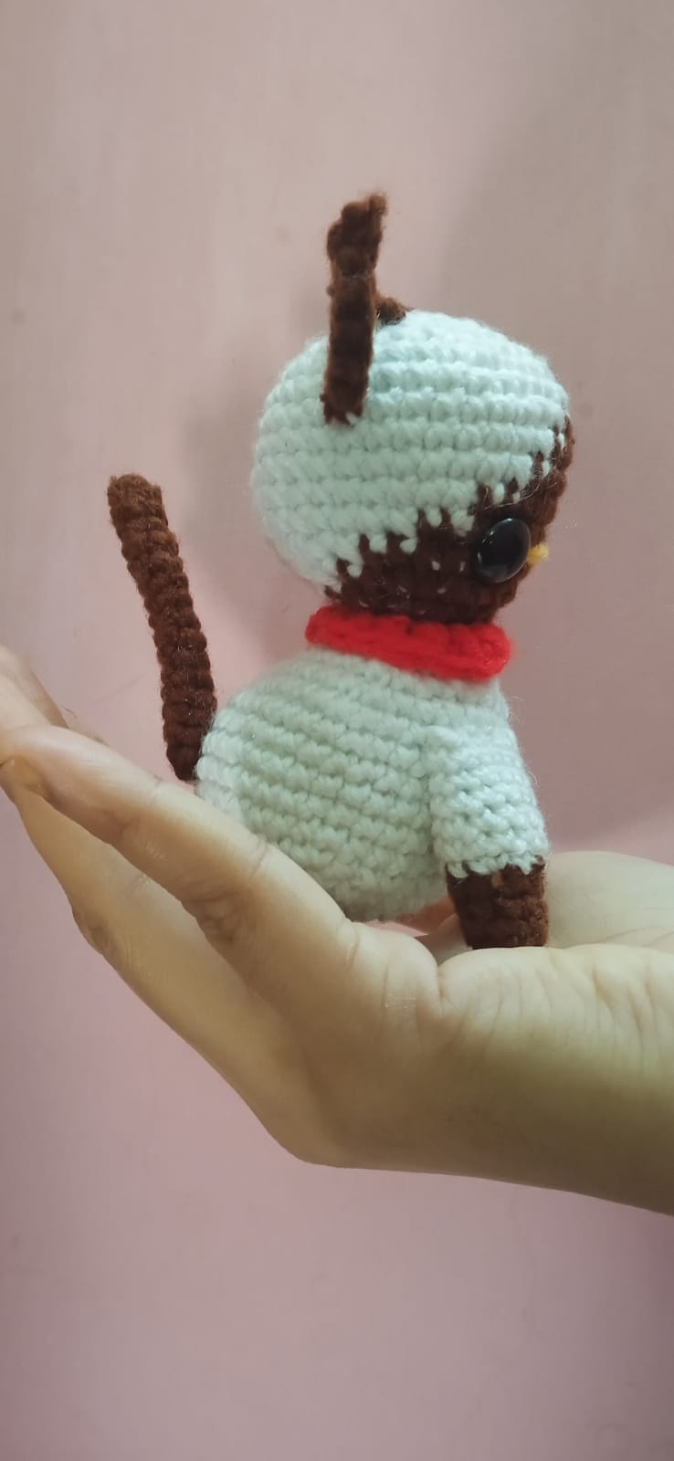 A charming and meticulously handcrafted crochet Siamese cat toy. This adorable feline friend is made with soft yarn and features the distinctive markings of a Siamese cat, making it a perfect gift for cat lovers of all ages.