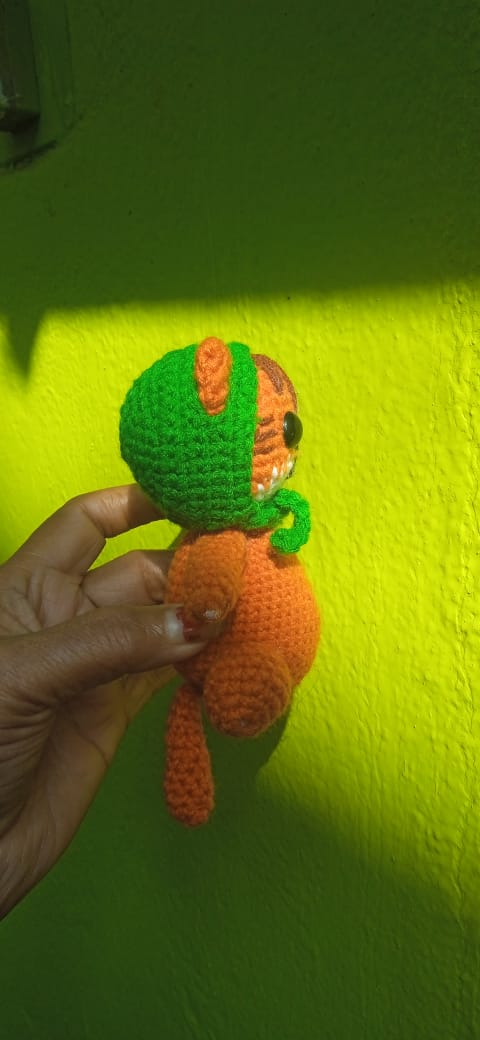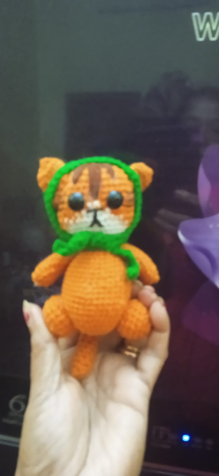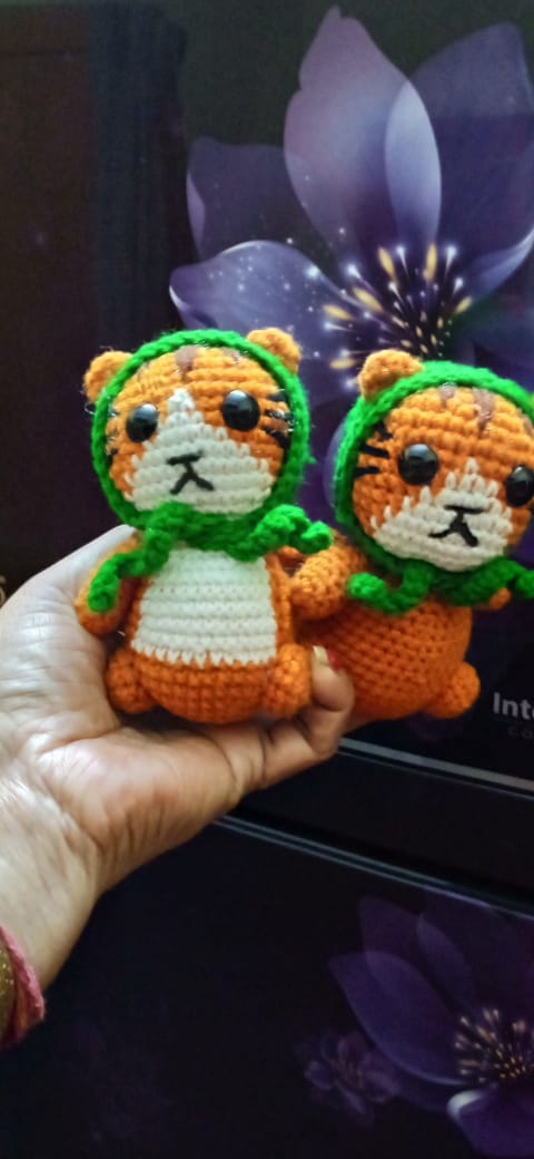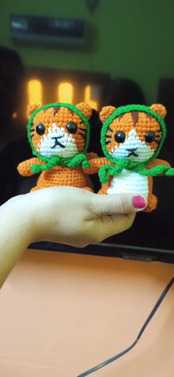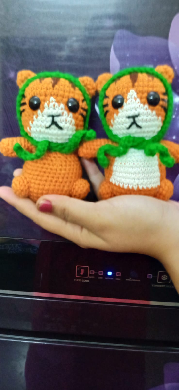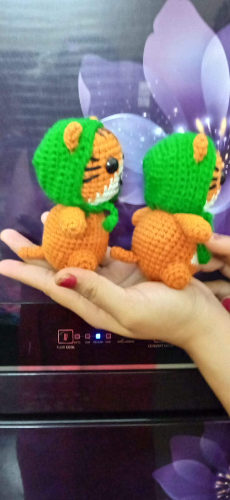 A charming and meticulously handcrafted crochet tiger toy. This adorable feline friend is made with soft yarn and features the distinctive stripes and playful design of a tiger, making it a perfect gift for children and animal lovers.