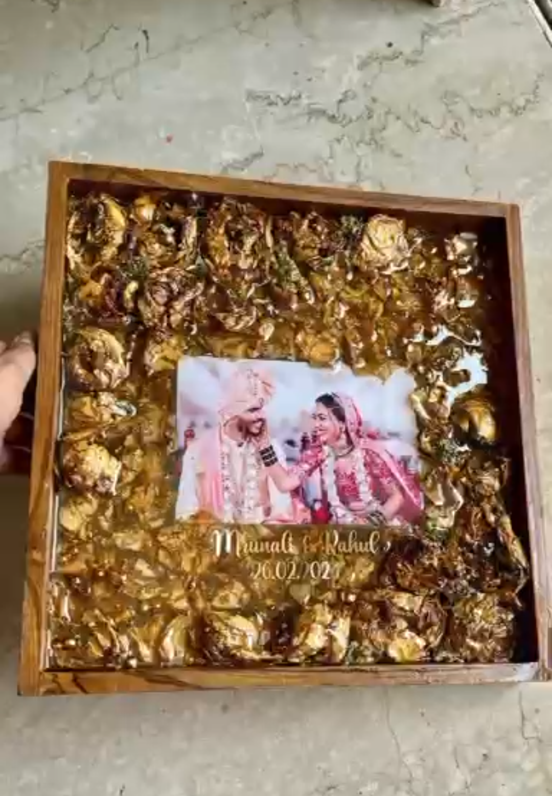 Preserve the cherished memories of Mrunalt and Rahul's wedding day with this beautifully crafted resin art frame. It features a central photograph of the couple, showcasing their wedding attire and garlands (varmala). The frame also includes their names, "Mrunalt & Rahul," and the wedding date "26.02.2024". The preserved varmala elements and metallic accents add a touch of elegance.