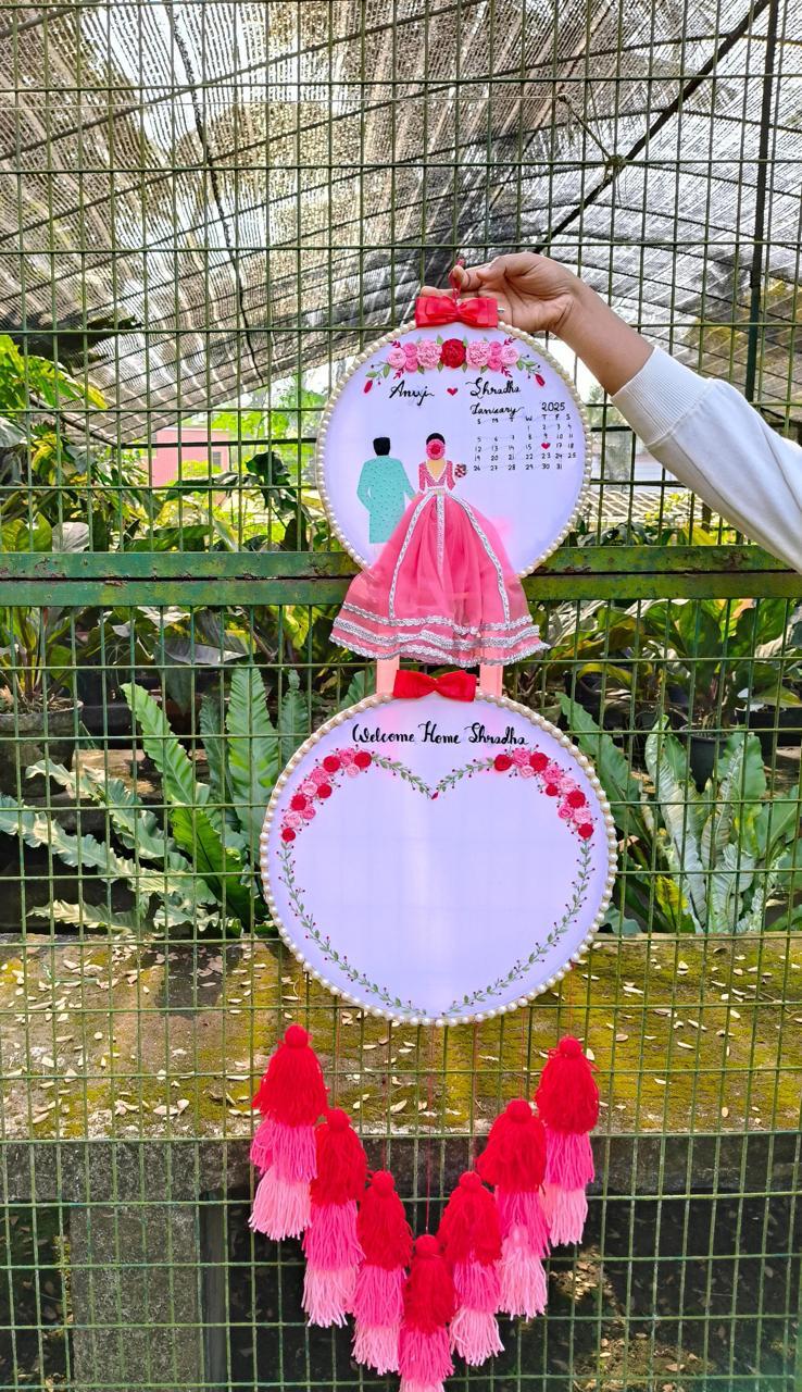 Celebrate the arrival of Shradha with this unique, handcrafted 'Embroidered Wall Hanging', made in India. This two-piece set features a circular hoop with 'Anuj Shradha January 2025' and a calendar design, along with embroidered figures of the couple in traditional Indian attire. The bride's dress is crafted from fabric with intricate lace detailing, adding a touch of elegance. The second hoop, shaped like a heart, features the message 'Welcome Home Shradha' surrounded by embroidered flowers and pearl embellishments. A decorative tassel garland hangs below. Each piece is crafted with care, showcasing the artistry of embroidery and fabric manipulation. This wall hanging is a beautiful and personalized welcome gift for Shradha, commemorating her arrival.